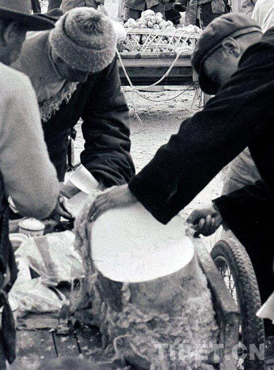 這是在藏北首府那曲鎮(zhèn)市場(chǎng)上,正在售賣的大坨酥油(唐召明1989年攝)