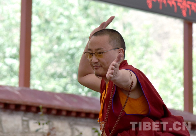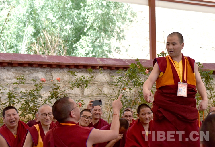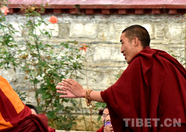 21日下午,西藏佛學院辯經(jīng)場巨大幕布下,來自西藏自治區(qū)、云南省的31名考僧正圍繞《俱舍論》《戒律論》進行互辯?,F(xiàn)場,只見格魯、寧瑪、苯波三個教派的考僧以及考評老師和西藏佛學院學僧各自圍坐。坐者為立宗者、站立者為辯手,站立者圍繞立論主題拋出佛學妙語,坐者認真聆聽、巧妙應對?;マq雙方氣氛熱烈,觀摩者不時唏噓、歡笑以表反對或認同。