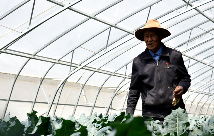 圖為邊巴頓珠在西蘭花棚里清理黃葉 攝影:王媛媛