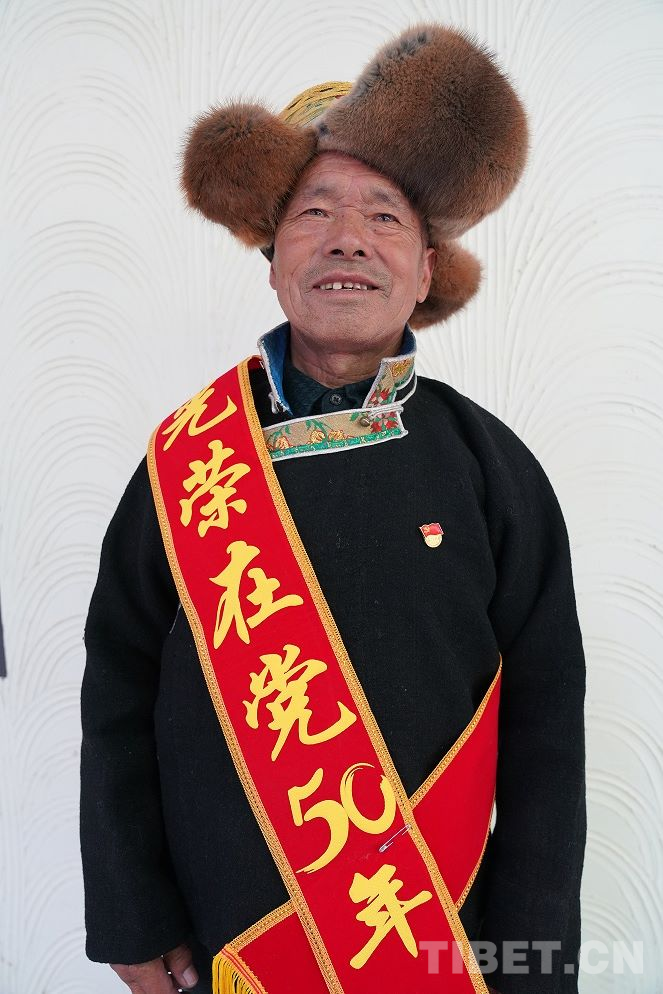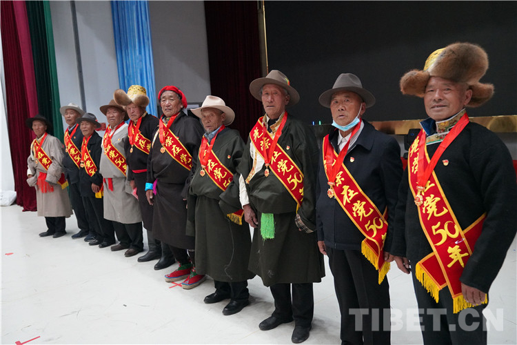 活動現場,為10名老黨員代表頒發(fā)了“光榮在黨50年”紀念章,敬獻了潔白的哈達。