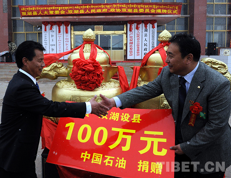 這是對(duì)口援助單位的中國(guó)石油為雙湖設(shè)縣捐贈(zèng)100萬(wàn)元。經(jīng)國(guó)務(wù)院批準(zhǔn),2013年7月26日,雙湖特別區(qū)“撤區(qū)建縣”正式掛牌(唐召明2013年7月26日攝)
