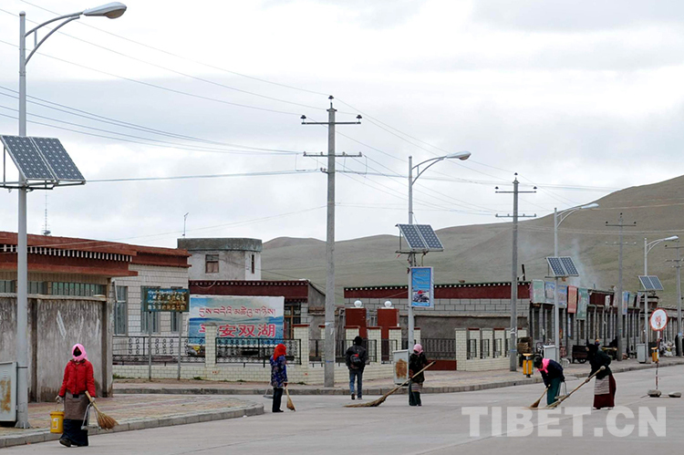 當(dāng)時(shí),經(jīng)過(guò)創(chuàng)業(yè)者三十多年的開(kāi)發(fā)建設(shè),雙湖鎮(zhèn)中心已有了一條筆直寬敞的水泥路,道路兩旁還有漂亮的太陽(yáng)能路燈和垃圾箱,黨政辦公樓、敬老院、職工活動(dòng)中心、幼兒園、普若崗日賓館、加油站等新建筑拔地而起,并建起了大型的太陽(yáng)能光伏電站。