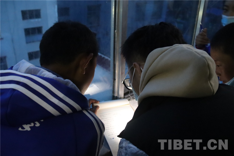 圖為支教團成員晚上在樓梯間為孩子們答疑輔導(dǎo) 何其睿 攝