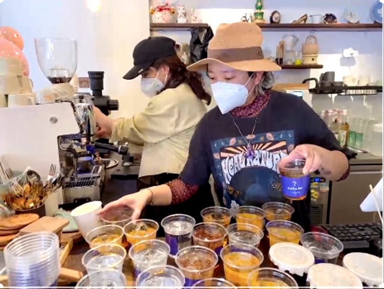 圖為“?Coffee Bar”咖啡店工作人員在為抗疫一線工作人員準(zhǔn)備愛心咖啡