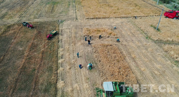 在達(dá)孜區(qū)雪鄉(xiāng)扎西崗村,隨著機(jī)器轟鳴,一顆顆金色飽滿的青稞粒構(gòu)成一扇彩虹門,有人在曬青稞、有人在裝袋、有人在搬運(yùn),一幅和諧的秋收?qǐng)D展現(xiàn)在眼前。