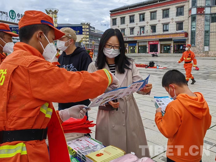 圖為消防員為過往群眾講解防滅火常識(shí)