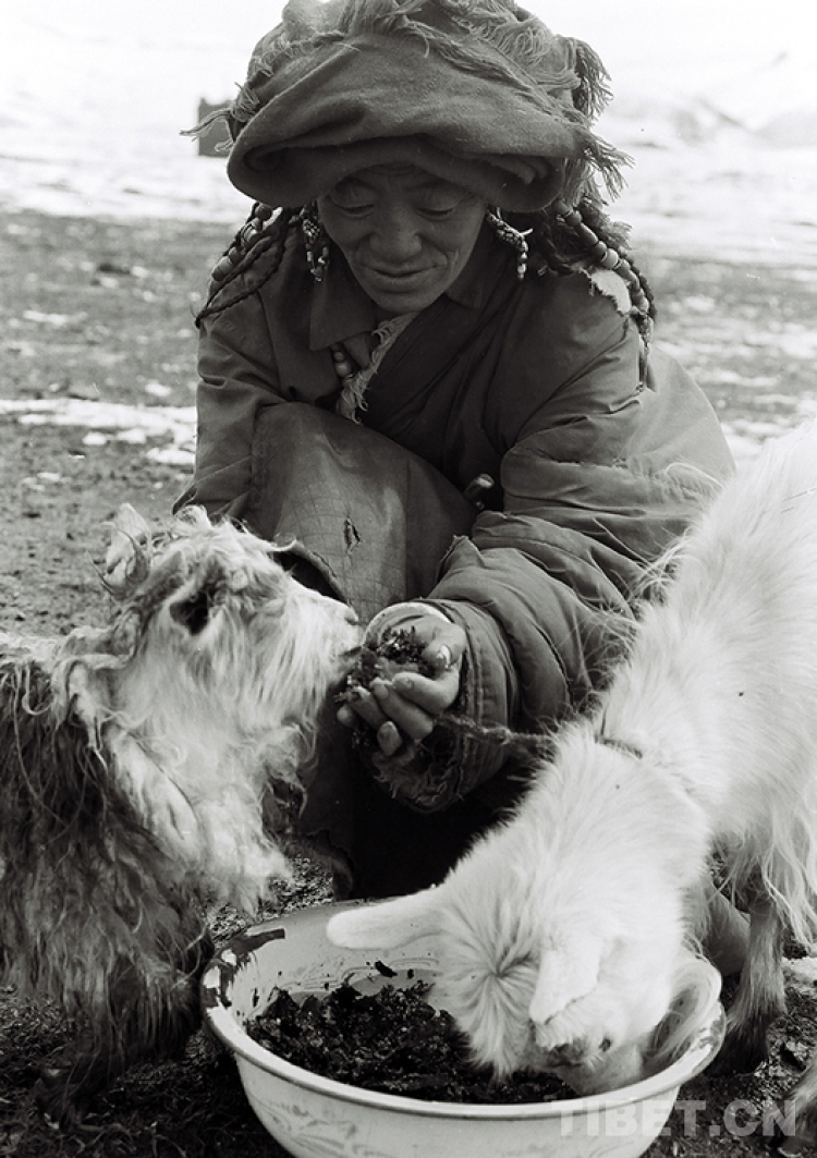 這是巴青縣一位牧女在雪災中為饑餓的幼畜進行補飼,以減輕自然災害所造成的損失(唐召明1990年攝)