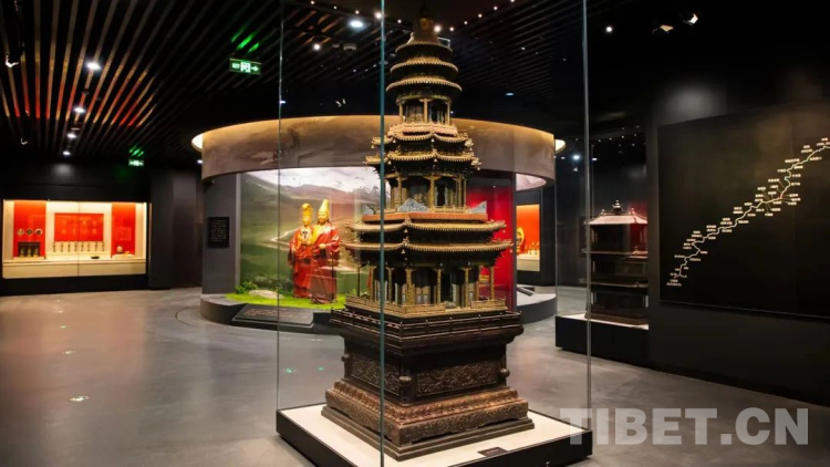 圖為承德博物館位于“望長城內(nèi)外——清盛世民族團結(jié)實錄”展廳的國家一級文物“清紫檀木座銅胎琺瑯塔”