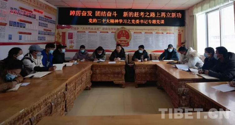 圖為洛扎縣拉郊鄉(xiāng)開展題為“踔厲奮發(fā)團結奮斗,新的趕考之路上再立新功”的黨的二十大精神學習之黨委書記講黨課活動。