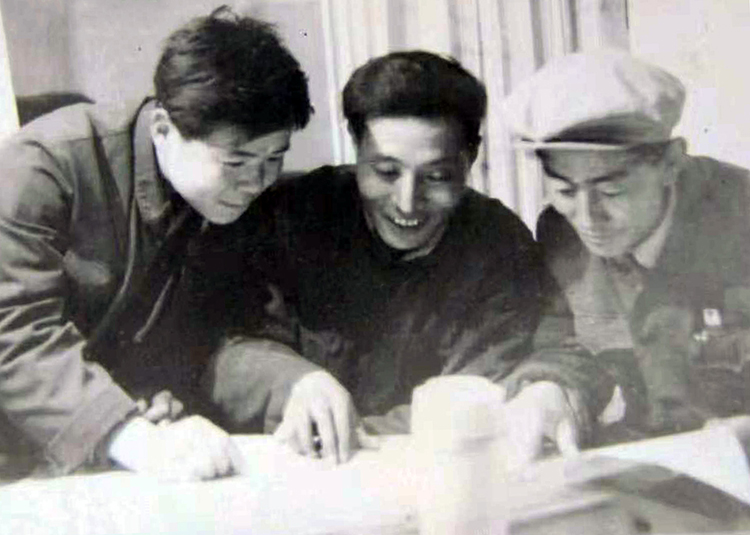 這是李業(yè)壯(左)在那曲地區(qū)農(nóng)機(jī)廠工作時(shí),與藏族副廠長(zhǎng)典地(中)、藏族技術(shù)員覺(jué)吉(右)一同研究開(kāi)發(fā)新產(chǎn)品 (唐召明提供,1978年攝)