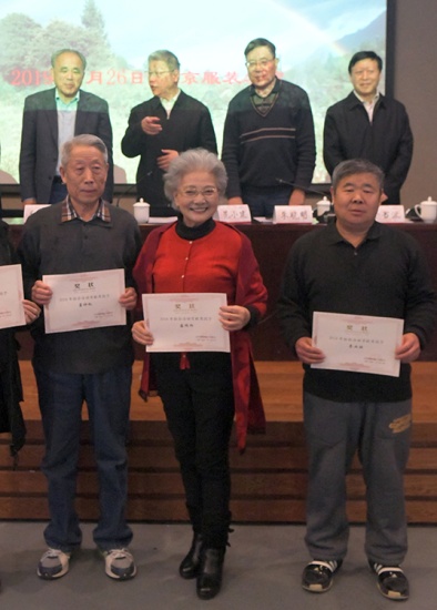 這是霍鐘權(quán)、盛瑞玲、李業(yè)壯(前排從左至右)在北京建藏援藏工作者協(xié)會(huì)代表大會(huì)上受到表彰(唐召明2019年1月26日攝)