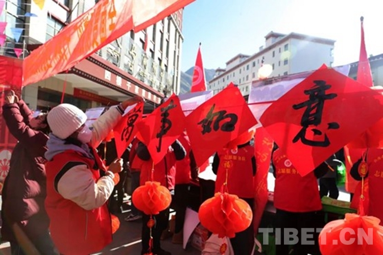活動現(xiàn)場,隨處可見的中國紅,吸引了眾多市民。一個個書案邊圍滿了人,山南市書法家協(xié)會的13名書法家現(xiàn)場潑墨揮毫,免費為過往群眾書寫藏漢文春聯(lián),將濃濃的情意、真誠的祝福融入到作品中,“吉祥如意、福如東海、扎西德勒……”字字吉祥,句句喜慶。