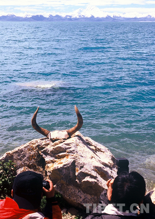 這是游客在拍攝納木錯和遠處綿延的念青唐古拉山美景(唐召明2001年攝)
