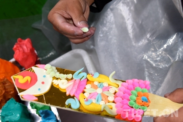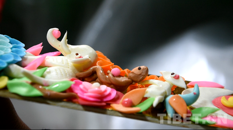 酥油花是藏民族雕塑藝術(shù)的一種特殊形式,它是以人物、花卉、樹(shù)木、飛禽、走獸等為主題的一種手工油塑藝術(shù),具有悠久的歷史。藏歷新年期間,西藏群眾會(huì)在切瑪盒的左右兩邊分別裝滿(mǎn)糌粑和炒青稞,然后在上面插上象征五谷豐登的“羅薩美朵”(彩色青稞穗)和寓意吉祥的酥油花。(中國(guó)西藏網(wǎng) 記者/次旦拉姆)