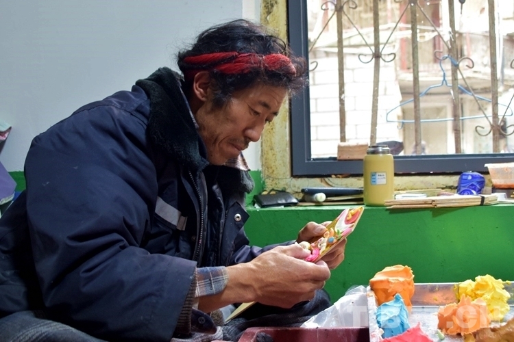 “我們一般在藏歷新年前20天左右到達(dá)拉薩。買(mǎi)酥油,和礦物染色原料調(diào)至成泥狀后便開(kāi)始捏制?!钡┰稣f(shuō),普松鄉(xiāng)有制作酥油花的傳統(tǒng),每年藏歷新年臨近,他們便結(jié)伴來(lái)到拉薩制作酥油花銷(xiāo)售。