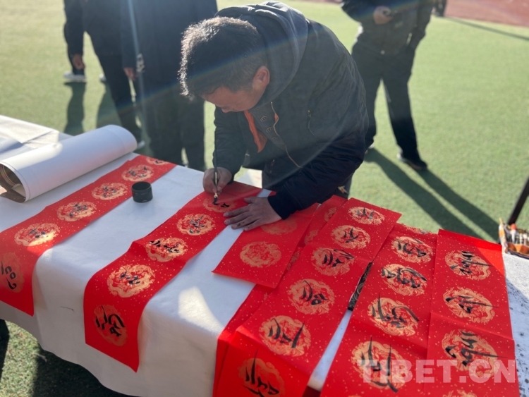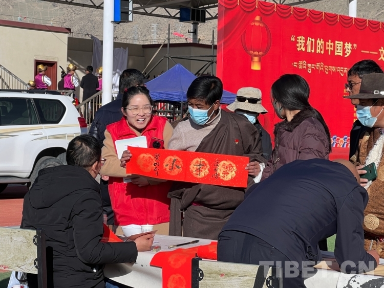 中國(guó)西藏網(wǎng)訊 2月16日,西藏自治區(qū)文聯(lián)主辦的“我們的中國(guó)夢(mèng)”——文化進(jìn)萬(wàn)家活動(dòng)在極高海拔生態(tài)搬遷安置點(diǎn)開(kāi)展。在送“書(shū)法”現(xiàn)場(chǎng),由西藏書(shū)法協(xié)會(huì)和山南市11位書(shū)法家為當(dāng)?shù)厝罕娝腿?00多張?jiān)⒁饷篮玫男履曜8:腿罕娖谕男履曜T傅?。活?dòng)現(xiàn)場(chǎng)群眾絡(luò)繹不絕,大家心滿意足地拿著書(shū)法家為自己贈(zèng)送的精美“禮品”。一旁書(shū)法家們忙碌地為群眾書(shū)寫(xiě)祝詞,另一旁群眾們晾曬著他們得到的書(shū)法作品,一時(shí)間現(xiàn)場(chǎng)成了“書(shū)法展”,時(shí)不時(shí)地有人前來(lái)參觀欣賞。(中國(guó)西藏網(wǎng) 記者/德吉卓瑪)