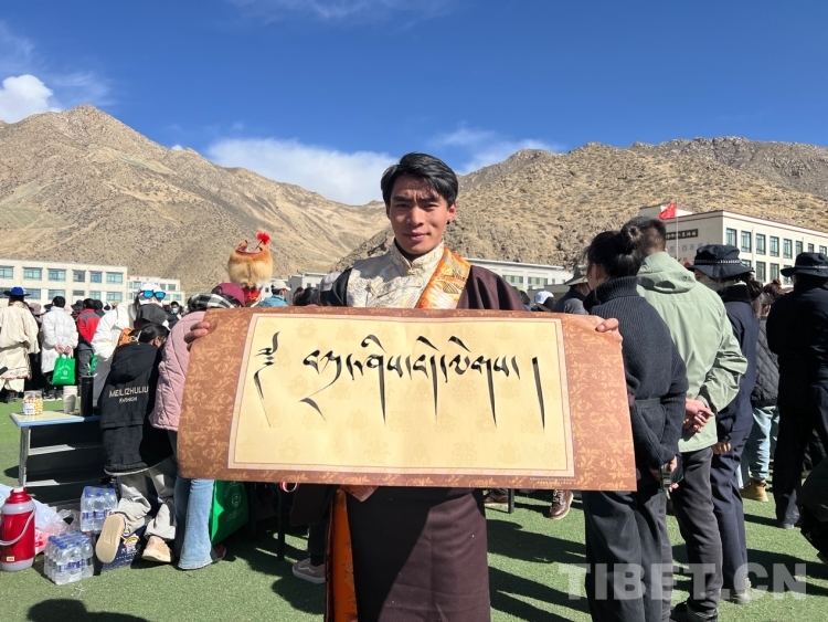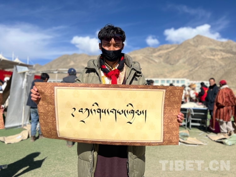 圖為群眾拿到寫(xiě)有“扎西德勒”字樣的書(shū)法作品 攝影:德吉卓瑪