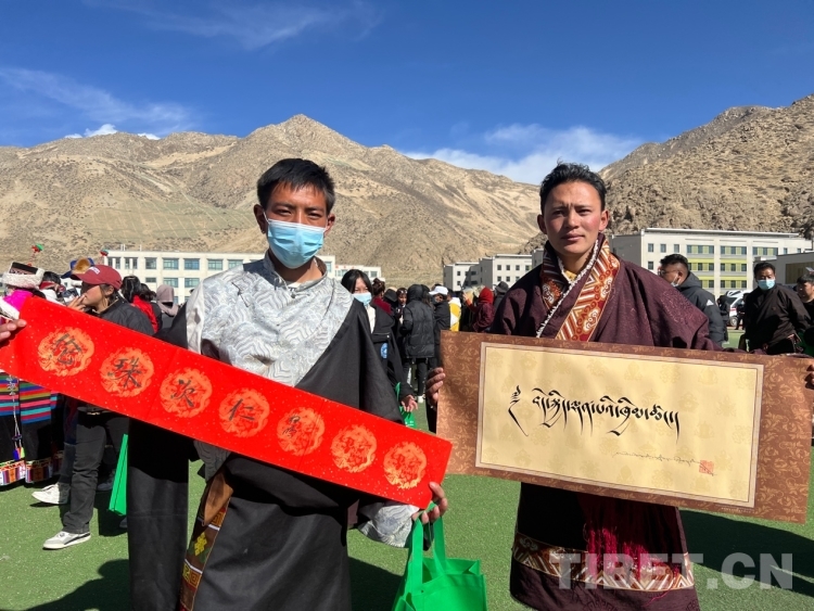 圖為群眾拿到寫(xiě)有“幸福家庭”字樣的書(shū)法作品 攝影:德吉卓瑪