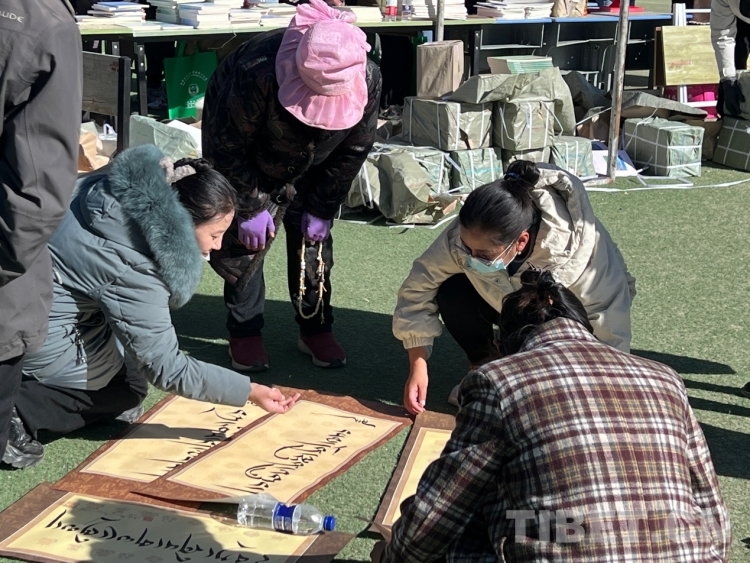 圖為書(shū)法家為群眾書(shū)寫(xiě)新年祝福(書(shū)寫(xiě)內(nèi)容:扎西德勒) 攝影:德吉卓瑪