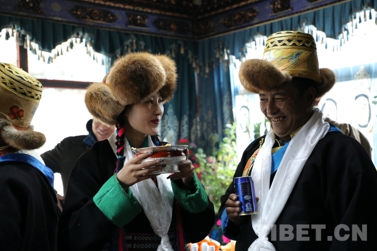 天亮以后,扎西江村一家人穿上新衣服,輪流敬切瑪、喝青稞酒,互道“扎西德勒”。扎西江村家的小女兒達(dá)娃倉(cāng)決吃切瑪?shù)臅r(shí)候,先用拇指和食指抓起一小撮糌粑灑向空中3次,表示敬天地,然后把糌粑放進(jìn)自己嘴里。喝青稞酒也同樣如此,要先用雙手接過酒杯,然后左手拿杯,右手無(wú)名指輕輕地在杯中蘸酒,彈向空中,如此反復(fù)三次。