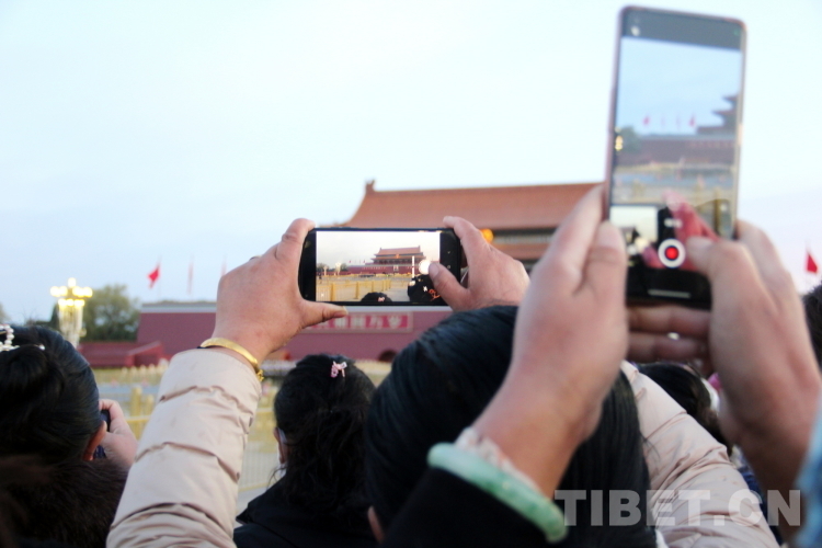 圖為“2023年西藏基層婦聯(lián)干部赴京學(xué)習(xí)參觀團”成員們紛紛用手機記錄下國旗護衛(wèi)隊行進的英姿 攝影:陳浩力