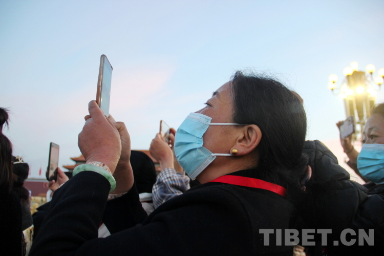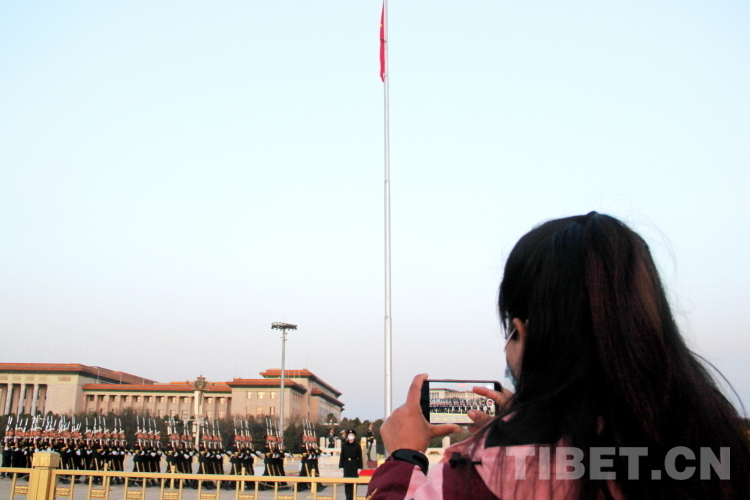 清晨6時許,軍樂團在天安門廣場就位。“正步走!”隨著一聲響亮的口令,國旗護衛(wèi)隊邁著鏗鏘的正步,拱衛(wèi)國旗走過天安門城樓、金水橋?!跋驀炀炊Y!”6時9分,隨著響亮的口令,軍樂團奏響了國歌《義勇軍進行曲》,升旗手高高揚起國旗,鮮艷的五星紅旗迎著朝陽冉冉升起。“2023年西藏基層婦聯(lián)干部赴京學(xué)習(xí)參觀團”成員們紛紛用手機記錄下這難忘的時刻。