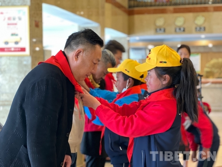 圖為學生代表向相關領導佩戴紅領巾 攝影:德吉卓瑪