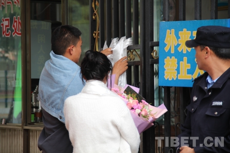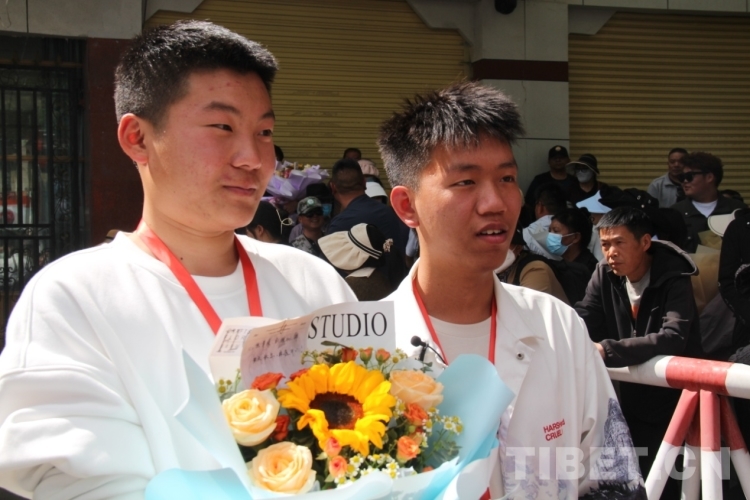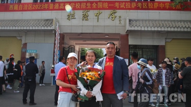6月8日下午,在拉薩中學(xué)考場外,家長們穿著藏裝、旗袍、印有“金榜題名”“旗開得勝”等加油短袖,手捧鮮花和哈達(dá)迎接第一波結(jié)束高考的考生?!敖裉?,閨女終于要結(jié)束高中生活了,希望她能如愿考上軍校?!眲?span style="background-color: rgb(255,255,255)">先生夫婦穿著專門為女兒定制的加油短袖,備好鮮花到考場外迎接女兒。像他們一樣,考場外拿著鮮花與哈達(dá)、祝賀橫幅、勵(lì)志牌等的考生家屬和親戚漸漸多了起來。