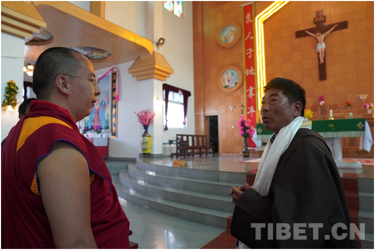鹽井天主教堂是西藏目前唯一保存下來并持續(xù)在使用中的天主教建筑,它的存在證明了不同宗教在西藏的和諧相處。在鹽井天主教堂班禪詳細(xì)了解天主教堂歷史起源、文化傳承、服務(wù)信眾等情況,當(dāng)班禪看到藏語版的《圣經(jīng)》時(shí)饒有興致地進(jìn)行翻看。