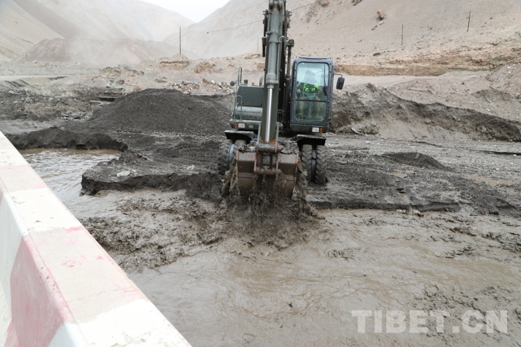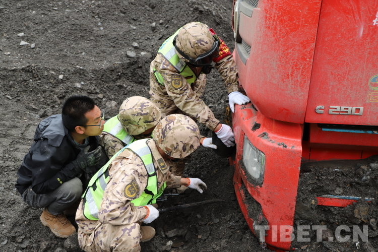 抵達現(xiàn)場后,武警官兵一邊安撫滯留群眾,給他們發(fā)放高原藥品;一邊對災害現(xiàn)場進行勘察,并制定科學合理的搶通方案。在指揮員的指揮下,他們采取“雙向掘進、先通后拓”的戰(zhàn)法進行搶通。因部分車輛深陷泥石流被困,為解救出車輛,他們利用繩索拖拽的方法對被困車輛進行救援。