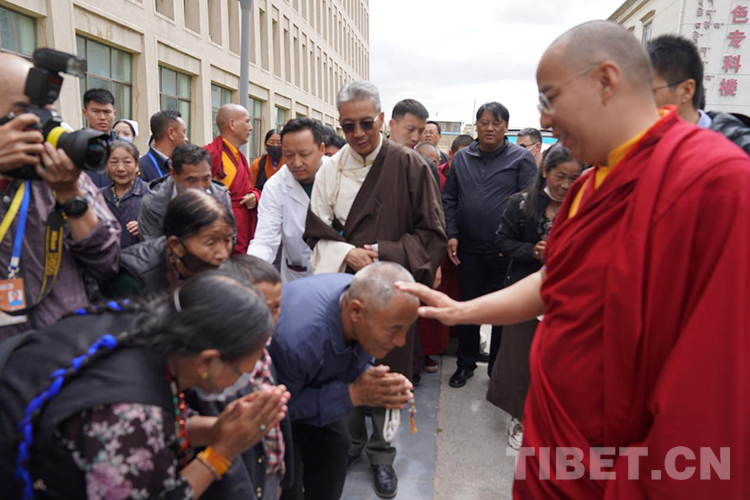 圖為班禪對醫(yī)院群眾進行摸頂賜福 攝影:王淑