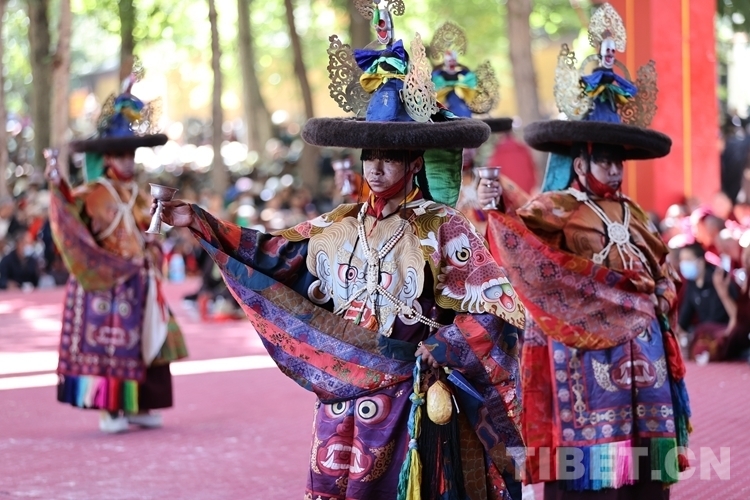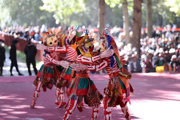 當渾厚悠遠的法號、法螺聲在大院內(nèi)外回旋開來,“羌姆”表演正式拉開帷幕。期間,僧人頭戴面具,身穿戲裝,手持鼓刀斧等道具,逐次表演金剛、骷髏、鹿牛、比丘、鴉鴟、六長壽等數(shù)十節(jié)神舞,氣氛莊重而神秘。
