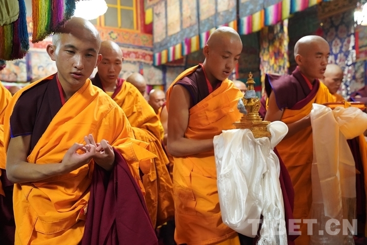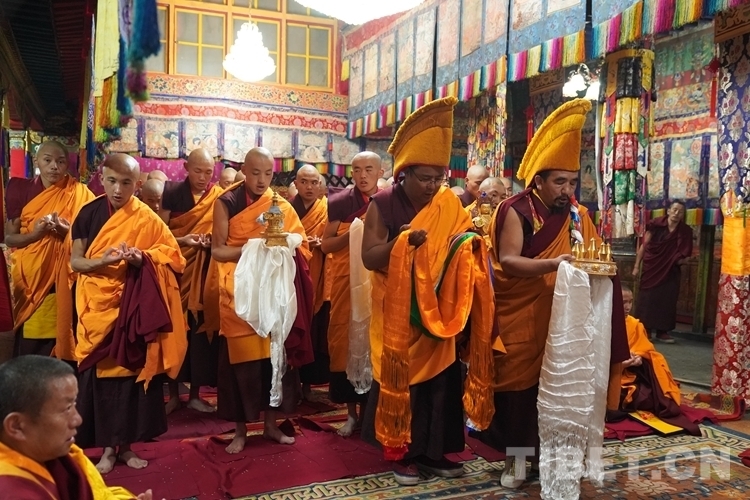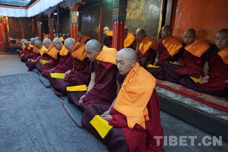 當天清晨,扎什倫布寺桑煙繚繞、法號聲聲,28 位受戒的年輕僧人帶著新制袈裟,迎著朝霞依次走向拉讓殿等待班禪授戒這一神圣時刻的到來。8時許,在手持黃傘、香爐和吹嗩吶的高僧護送引領下班禪緩緩步入拉讓殿,并與在場僧眾集體誦經(jīng)。誦經(jīng)儀式結束后,班禪就坐于拉讓殿寶座,4名高僧大德作為授戒眾,開始為僧人閉門授戒、剃度、賜法名、摸頂。此時,受戒僧人一一入座,兩手在胸前交叉,聽班禪引證經(jīng)典告誡,并宣誓嚴守戒律。