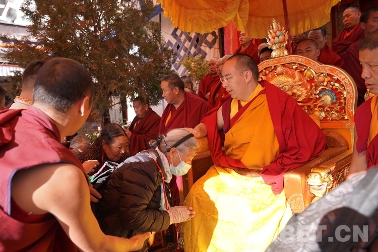 10時許,法號陣陣,班禪在僧眾的簇擁下來到扎什南捷靈塔殿前,面帶微笑登上寶座盤腿坐定,數位僧人恭立兩旁,齊聲誦讀祈禱祝福經文,手捧哈達的信教群眾脫帽、躬身、俯首,滿懷虔敬依次來到寶座前,班禪笑容慈和地一一為他們摸頂賜福。