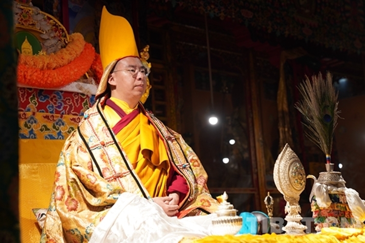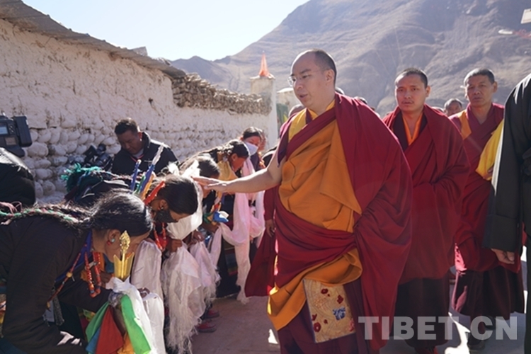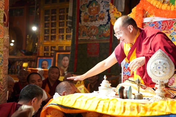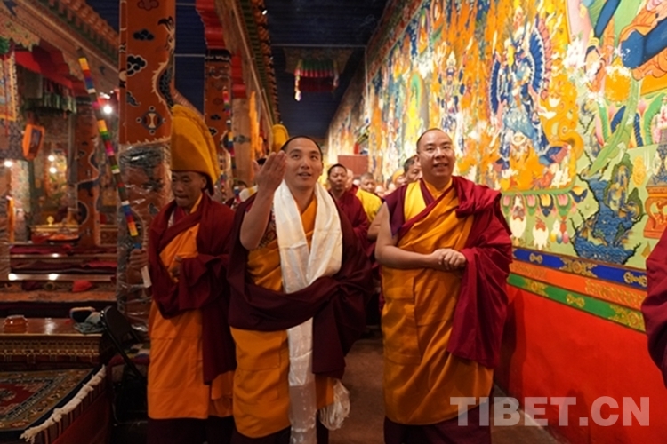 當(dāng)日12時許,班禪一行抵達日吾其鄉(xiāng),班禪笑容慈和地一一為等候在寺廟前的信教群眾摸頂,并向表演迥巴藏戲的信教群眾揮手致意。隨后,手持香爐的高僧和吹嗩吶的僧人引路,在手持黃傘的高僧護送下,班禪緩步進入主殿,朝拜大威德金剛拉康,參觀石刻、擦擦文物陳列室后登上大殿寶座,向寺廟僧眾傳授《勝道啟門頌》,為僧眾摸頂。