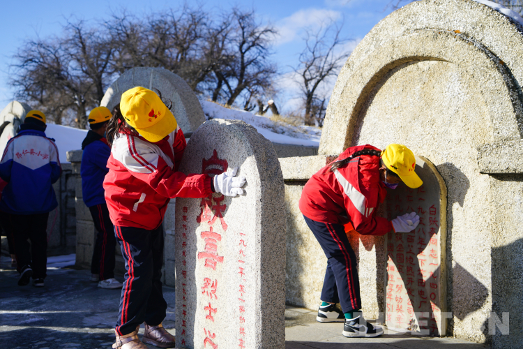 圖為多白鄉(xiāng)小學(xué)生在拉薩市烈士陵園內(nèi)擦拭烈士墓碑 攝影:趙振宇