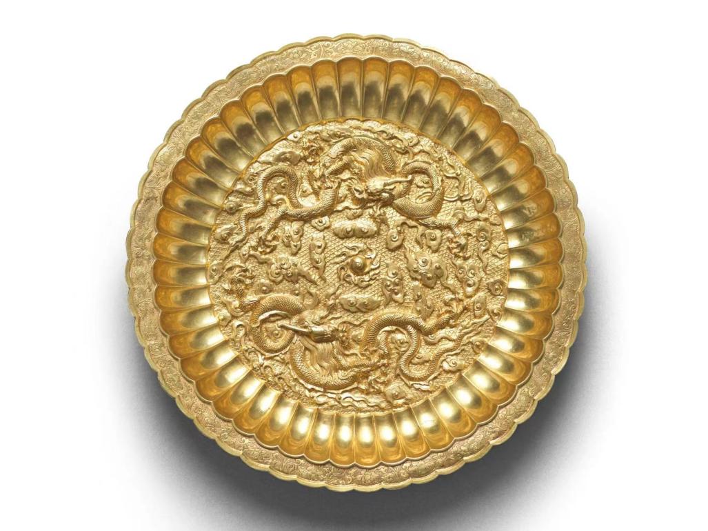 圖為公元18世紀(jì)雙龍戲珠菊瓣金盤