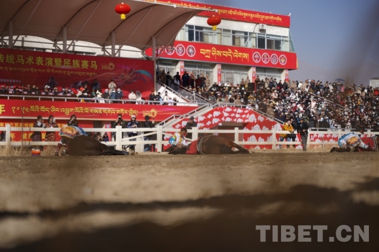 中國西藏網(wǎng)訊 2月12日上午,藏歷木龍新年初三民族傳統(tǒng)馬術(shù)表演暨民族賽馬活動(dòng)在拉薩賽馬場舉行。此次活動(dòng)包括民族賽馬和馬術(shù)表演。其中,民族賽馬包括3000米、5000米、8000米三個(gè)項(xiàng)目,馬術(shù)表演共有18個(gè)大項(xiàng)、20余個(gè)小項(xiàng)。馬術(shù)表演與民族賽馬穿插進(jìn)行。現(xiàn)場約8000名觀眾共同欣賞了精彩的馬術(shù)表演,觀看了激烈的速度賽馬,共慶佳節(jié)。