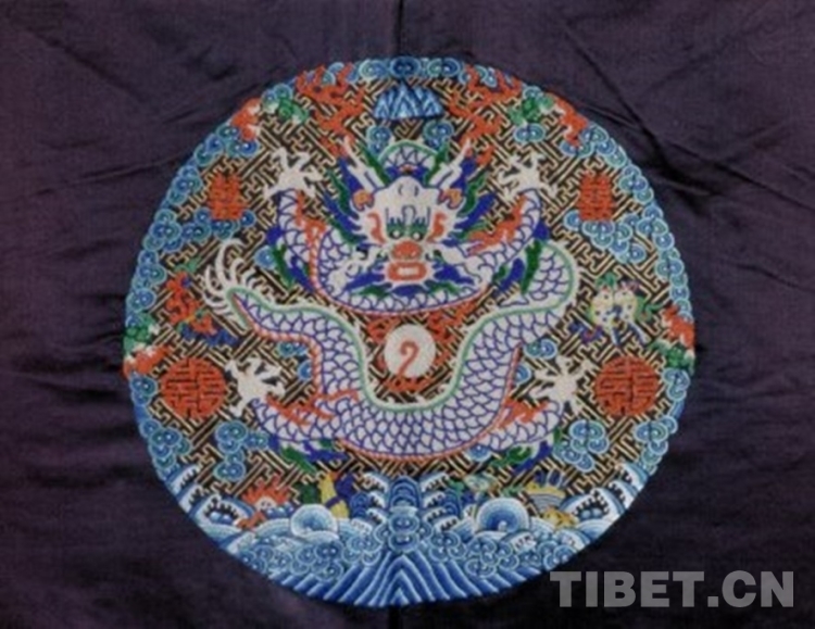 褂圓領(lǐng),對(duì)襟,平袖,裾后開。褂用二至四色暈法,在石青色緞地上以平針、套針、平金等針法及緝米珠工藝彩繡、穿綴萬字地八團(tuán)彩云白龍紋、海水江崖及雜寶等紋樣。袍內(nèi)襯月白色祥云團(tuán)龍壽字織金緞里。袖口沿鑲石青萬字織金緞邊。領(lǐng)口綴銅鎏金鏨花扣一,余綴石青色織金緞扣袢四。