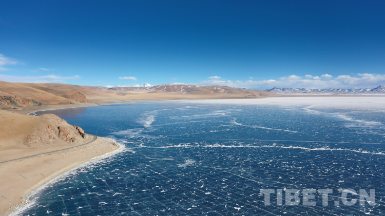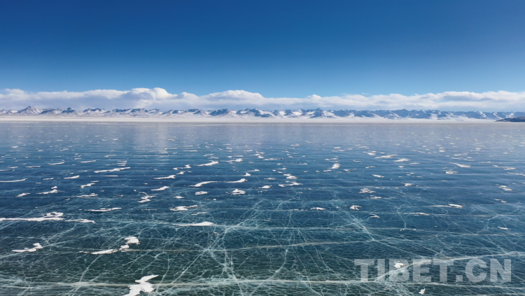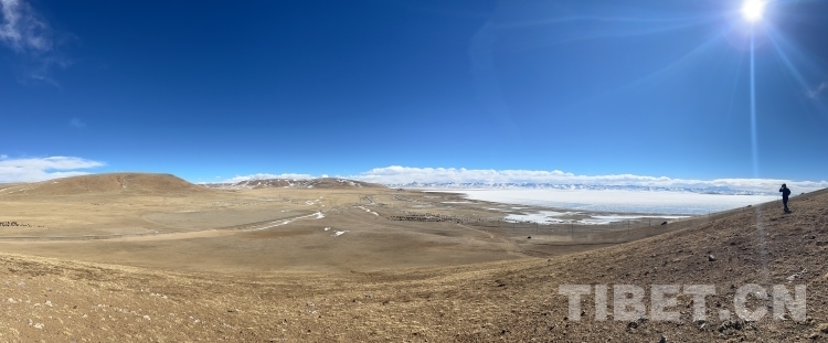 爬上一座山丘,視野陡然明亮開闊起來。原本土黃色的藏北天然牧場高低起伏,黑牦牛零星地散落在山坡,登上高處后,天際圣境納木錯便映入眼簾。初春時節(jié)的拉薩依然春寒料峭,納木錯的落雪還未完全消融,站在高處俯視,這片安靜的大湖被陽光反射得白茫茫一片。更幸運(yùn)的是碰到了晴好的天氣,白云與湖冰相襯,亦與遠(yuǎn)山相接,視線盡頭的念青唐古拉山脈直視無礙,畫面猶如“半池白云半池玉”般頗具美感。