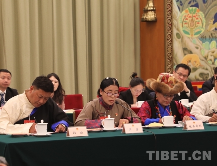 圖為其德在十四屆全國人大二次會議西藏代表團開放團組會議上發(fā)言 攝影:桑吉