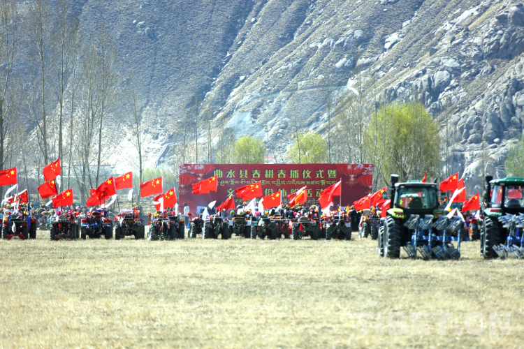 整個(gè)活動(dòng)充滿儀式感。村民們先是來到田地中央燃桑香、獻(xiàn)貢品,祈求風(fēng)調(diào)雨順、無災(zāi)無害、莊稼豐收。開耕第一犁在吉祥喜慶的藏戲《扎西雪巴》表演中拉開了序幕,一輛輛插著五星紅旗,用五彩哈達(dá)、花朵、吉祥圖案裝扮一新的拖拉機(jī)一字排開,涌向待墾的農(nóng)田進(jìn)行翻耕,播撒第一粒種子。