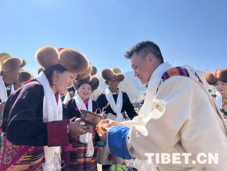 開耕儀式結(jié)束后,茶巴朗村藏戲隊(duì)成員們?yōu)樵缫褤Q好藏裝過來體驗(yàn)西藏民俗文化的游客們獻(xiàn)哈達(dá)、敬青稞酒、唱敬酒歌,游客們現(xiàn)場學(xué)起“三口一杯”與當(dāng)?shù)厝斯捕冗@美好的一天。西藏卓美旅行社負(fù)責(zé)人孫赫男介紹說:“西藏除了山水美景之外,春耕儀式也是非常具有當(dāng)?shù)靥厣奈幕?,能給人留下深刻記憶。今天,我?guī)е鴣碜员鄙蠌V等全國各地的游客來這里體驗(yàn)春耕儀式,讓大家看看西藏當(dāng)?shù)氐娜罕娛窃鯓娱_始春天的。游客們穿著藏裝,免費(fèi)品嘗青稞酒、酥油茶、牛肉、藏雞蛋等各種農(nóng)產(chǎn)品,還和充滿熱情的當(dāng)?shù)卮迕駛兓?dòng),他們玩得非常開心。”
