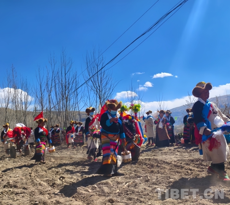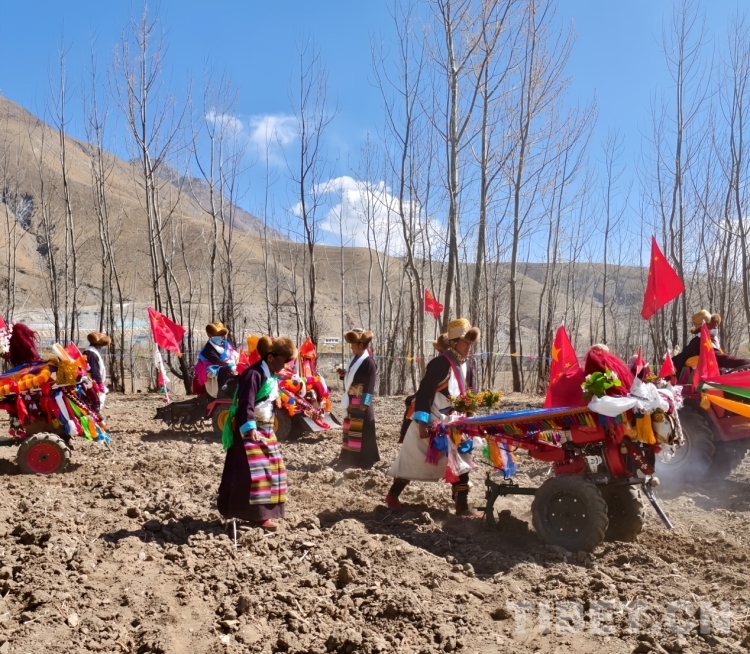 當(dāng)天,村里的男女老少穿上節(jié)日盛裝,手捧哈達(dá),高舉青稞美酒,從村子的各個(gè)角落來(lái)到村東頭一塊叫作“聶西滅”的肥沃土地上,男人們駕駛著用彩旗、花束妝點(diǎn)的拖拉機(jī),伴隨著一陣陣轟鳴聲,春耕儀式正式開(kāi)始。新耕的第一犁,由一個(gè)屬相與今年屬相相符的婦女撒出吉祥、幸運(yùn)的種子,其余的拖拉機(jī)一對(duì)跟著一對(duì)地翻耕,每臺(tái)拖拉機(jī)后面都跟隨著一位盛裝的婦女,她們左手提一桶種子,右手有節(jié)奏地?fù)]擺,翻出沉寂一冬、透著泥土芬芳的肥沃土地,把種子撒入希望的田野。翻耕結(jié)束后,各家各戶把春耕歡慶時(shí)用的青稞酒、卡賽、切瑪?shù)葦[放在供桌上,孩子們?cè)谔镩g喧鬧戲耍,將村民們其樂(lè)融融、喜氣洋洋的美好生活景象體現(xiàn)的淋漓盡致。