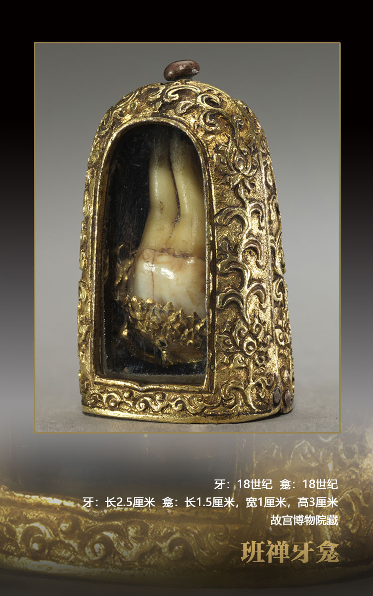 佛教世界的傳統(tǒng)觀念認(rèn)為,牙也是舍利的一種。在藏傳佛教中,上師火化后留下的牙、骨等均視為神圣之舍利,或供于佛堂,或葬于佛塔內(nèi),永久禮拜。這顆班禪牙也應(yīng)視為班禪最神圣的法物——舍利來(lái)看待。