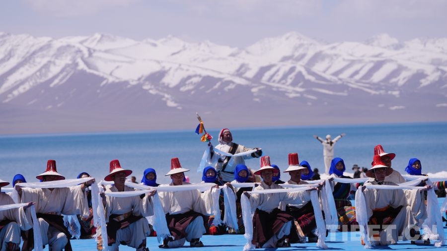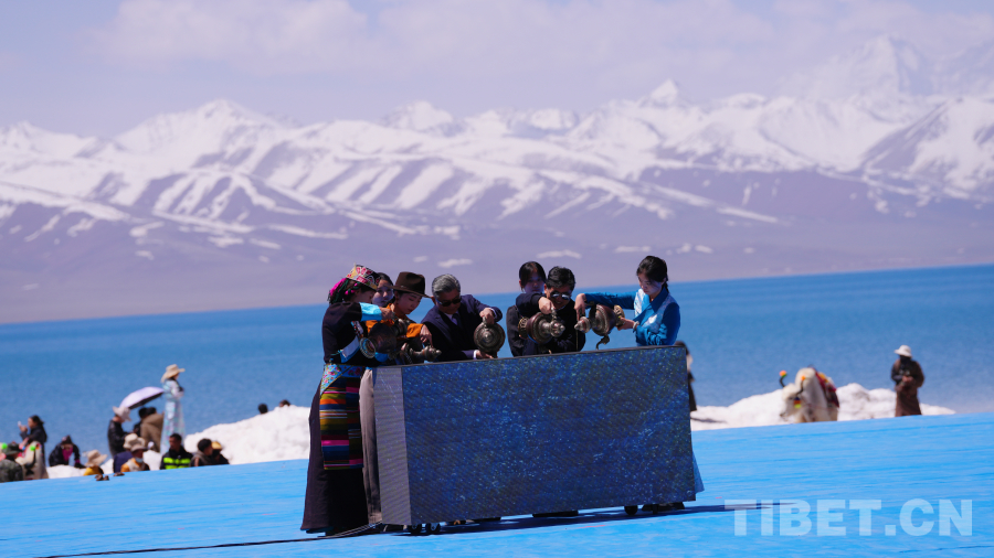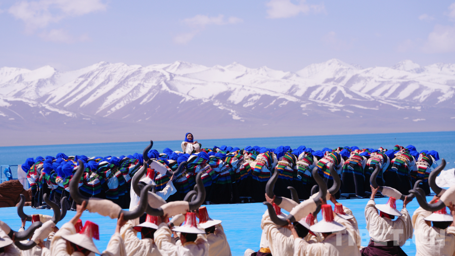 念青唐古拉山脈皚皚雪山高聳入云,清澈碧藍(lán)的納木錯(cuò)湖水一望無際,牧民牽著白牦牛在湖邊悠閑地散步,成群的棕頭鷗發(fā)出歡快的叫聲在空中自由飛翔……在令人如癡如醉的絕美景色為背景的祈福儀式上,身著盛裝的300名演員結(jié)合當(dāng)?shù)孛袼孜幕?,手捧哈達(dá)、牛角、烏爾朵(拋石器)等呈現(xiàn)盛大的祈福儀式,給現(xiàn)場(chǎng)觀眾帶來一場(chǎng)羌塘高原別具一格的視覺盛宴。