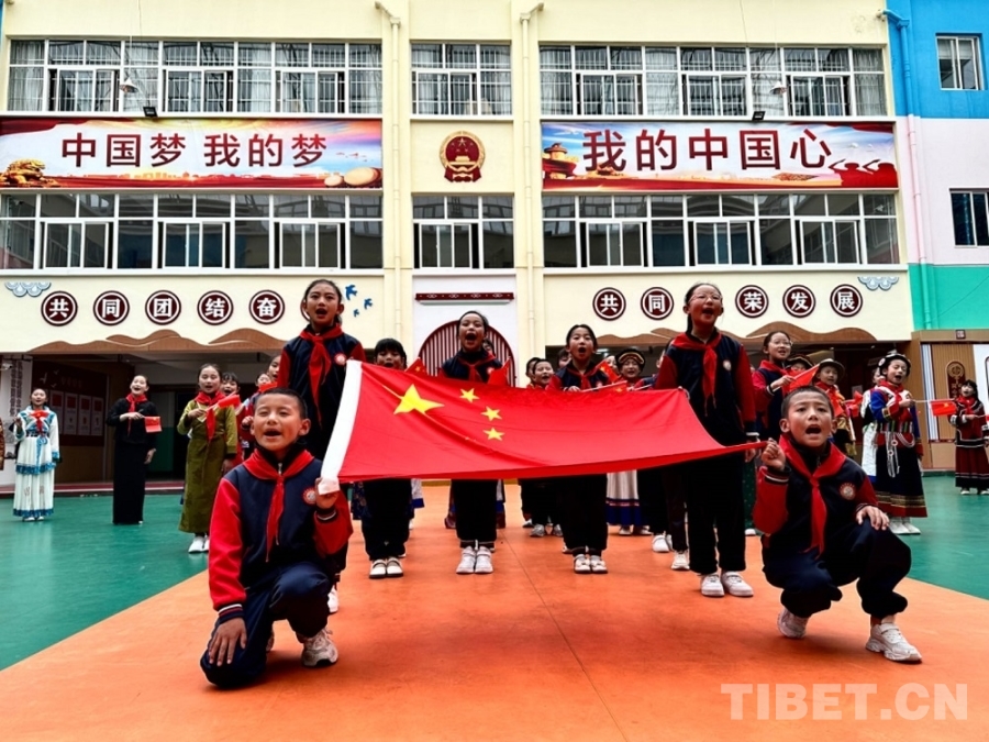 正在大課間休息的同學(xué)們,在老師的帶領(lǐng)下紛紛涌向操場(chǎng),伴隨著歡快的舞曲跳起了藏族鍋莊;合唱團(tuán)的孩子們唱起了該校自主編創(chuàng)的社會(huì)主義核心價(jià)值觀24字童謠,孩子們挺拔的身姿和鏗鏘的歌聲,盡顯文化自信和民族自豪感。