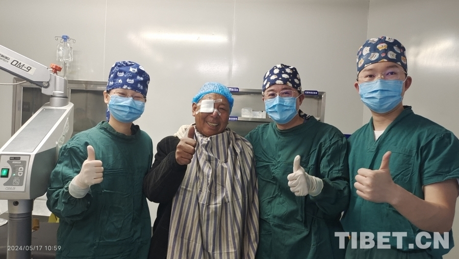 圖為患者拉巴對為自己實(shí)施眼科手術(shù)的醫(yī)生豎起大拇指