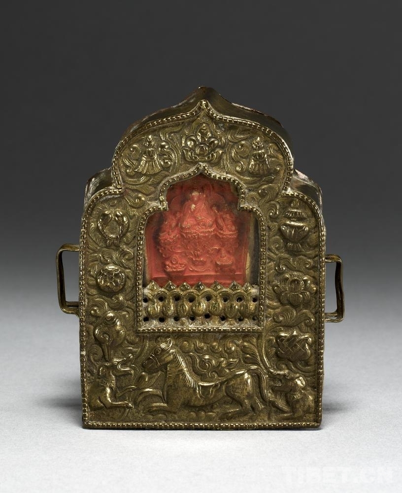 19號(hào)藏品為銅制“嘎烏”,內(nèi)裝有“擦擦”和香料包,出自西藏,進(jìn)入館藏時(shí)間為1905年?!案聻酢保遣卣Z的音譯,指護(hù)身佛的盒子,即小型佛龕。盒子里一般裝有“擦擦”佛像、印著經(jīng)文的綢片、舍利子或者甘露丸、由高僧念過經(jīng)的藥丸,以及活佛的頭發(fā)、衣服的碎片等。“嘎烏”還是精美的裝飾品。其形狀不一,一般為銀質(zhì)或銅質(zhì),盒面上鑲嵌有瑪瑙、綠松石,雕刻有多種花紋圖案。