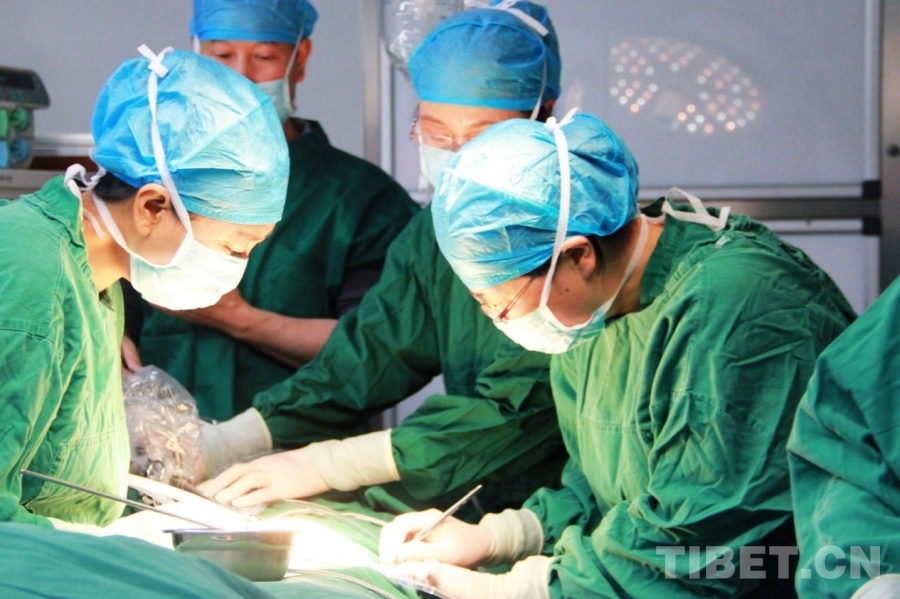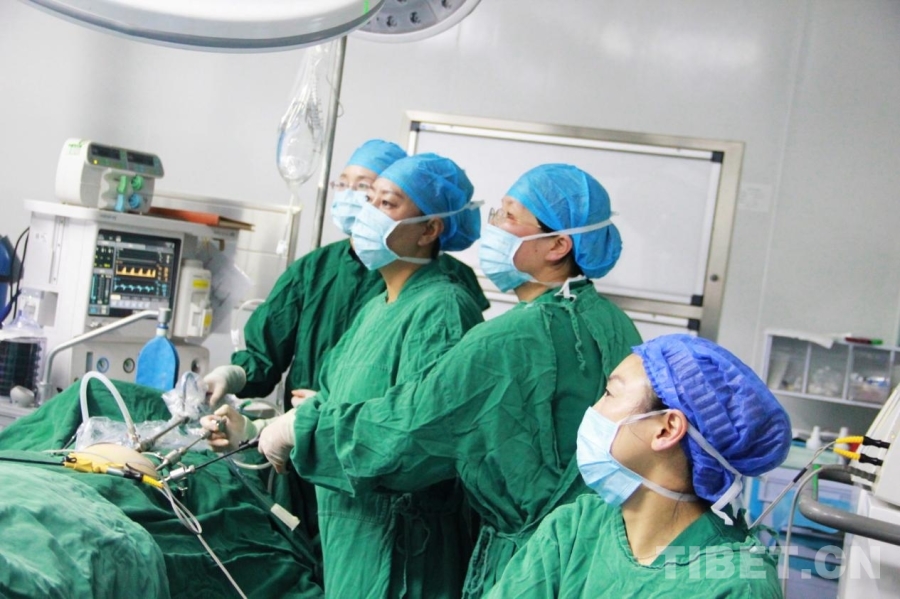 圖為航空總醫(yī)院婦科主任余立群(右二)在手術(shù)中指導(dǎo)甘孜縣人民醫(yī)院醫(yī)生操作手術(shù) 攝影:劉莉